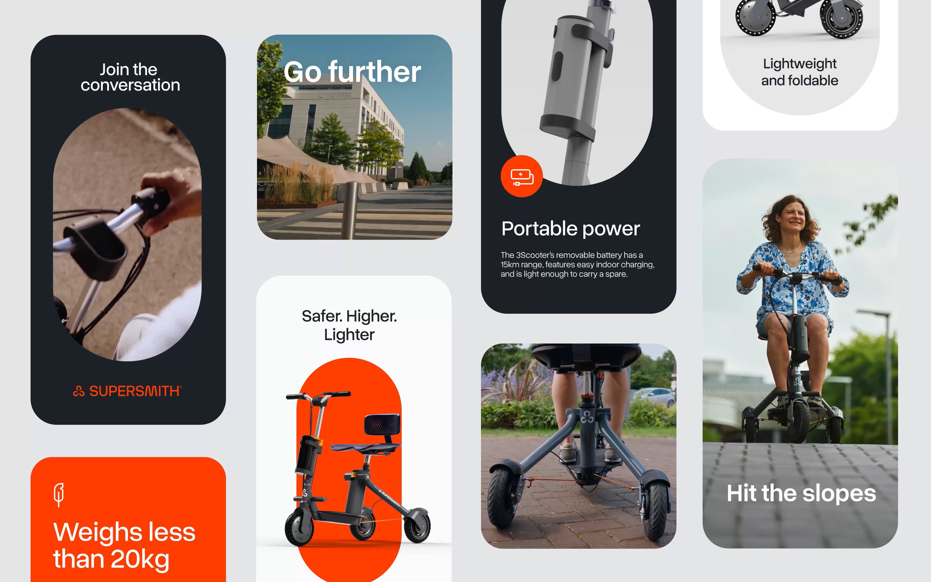 To bring this vision to life, we developed a brand video that goes beyond functionality, focusing on empowerment and celebrating inclusivity. Guided by insights from Supersmith and their community of testers, the video speaks directly to its target audience, highlighting the challenges faced by those who rely on mobility aids—obstacles often unnoticed by those who don’t. By highlighting the transformative impact of the 3Scooter, it shifts from being just an aid, to a source of liberation and a means to embrace life.